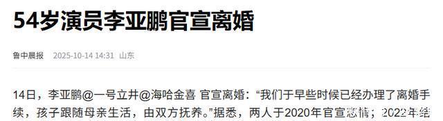 鲁中晨报2025-10-1454岁演员李亚鹏官宣离婚