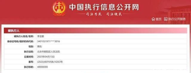 在结婚的第8年,李亚鹏和王菲宣布结束婚姻关系。 并且在2014年的时候,李亚鹏宣布退出娱乐圈。 这一系列的变故,引得当时的网友议论纷纷。 时间线来到了2023年,有爆料李亚鹏被强制执行了4000万。