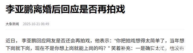 而李亚鹏在近日也针对,自己是否会复出拍戏做出了回答。 他表示,网友们把拍戏想的太简单了,当初说不拍就不拍了。 现在可不是自己想拍就能去拍的。