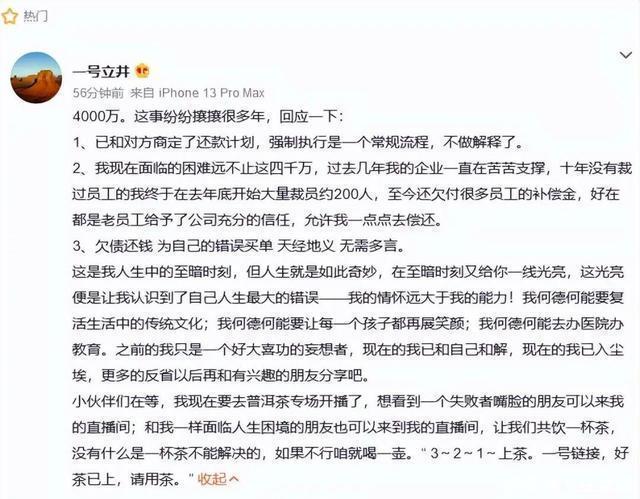 针对这件事,李亚鹏也非常坦率的做出了回应。 他表示,已经和对方定好了还款计划,至于强制执行只是一个常规的流程。 并且,还向大家透露出, 自己所面临的困难,并不止这4000万。 自己的公司十年没有裁过员,但现在因为各方面的压力。