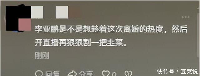 李亚鹏就是死要面子活受罪,非要沉浸在自己不擅长的领域,浪费了不少时间。 还有网友表示,李亚鹏是不是想趁着这次离婚的热度,然后开直播再狠狠割一把韭菜。 转眼间,就来到了李亚鹏官宣离婚后的首次直播。