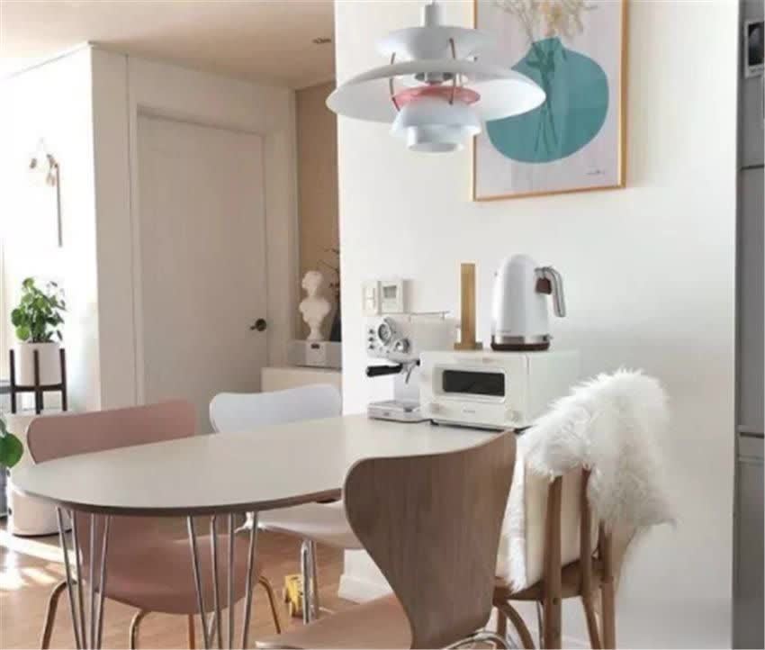 改造过后的餐厅,颇具现代风的氛围,桌椅的白色给室内带来了些许精致高级的感觉。